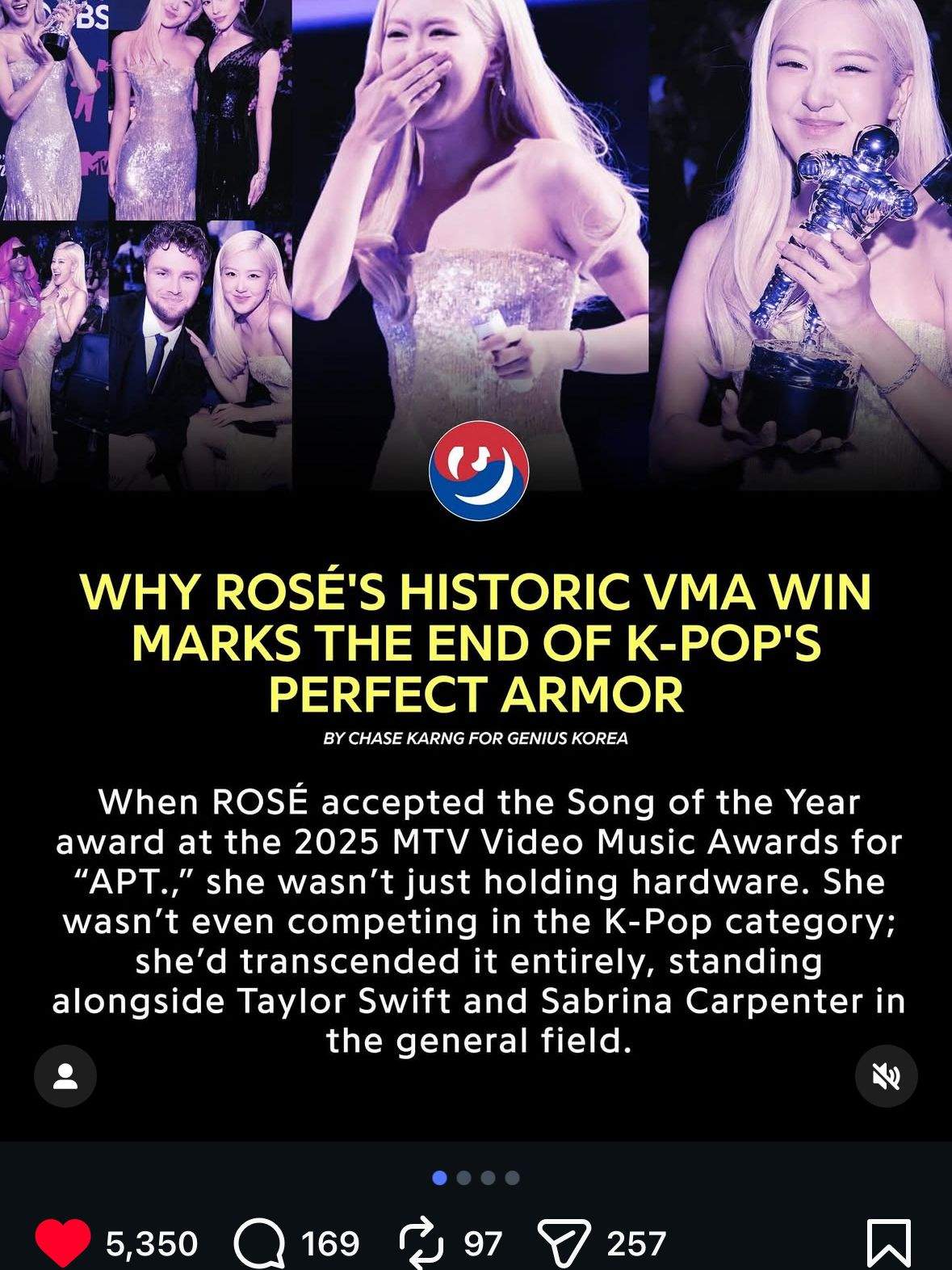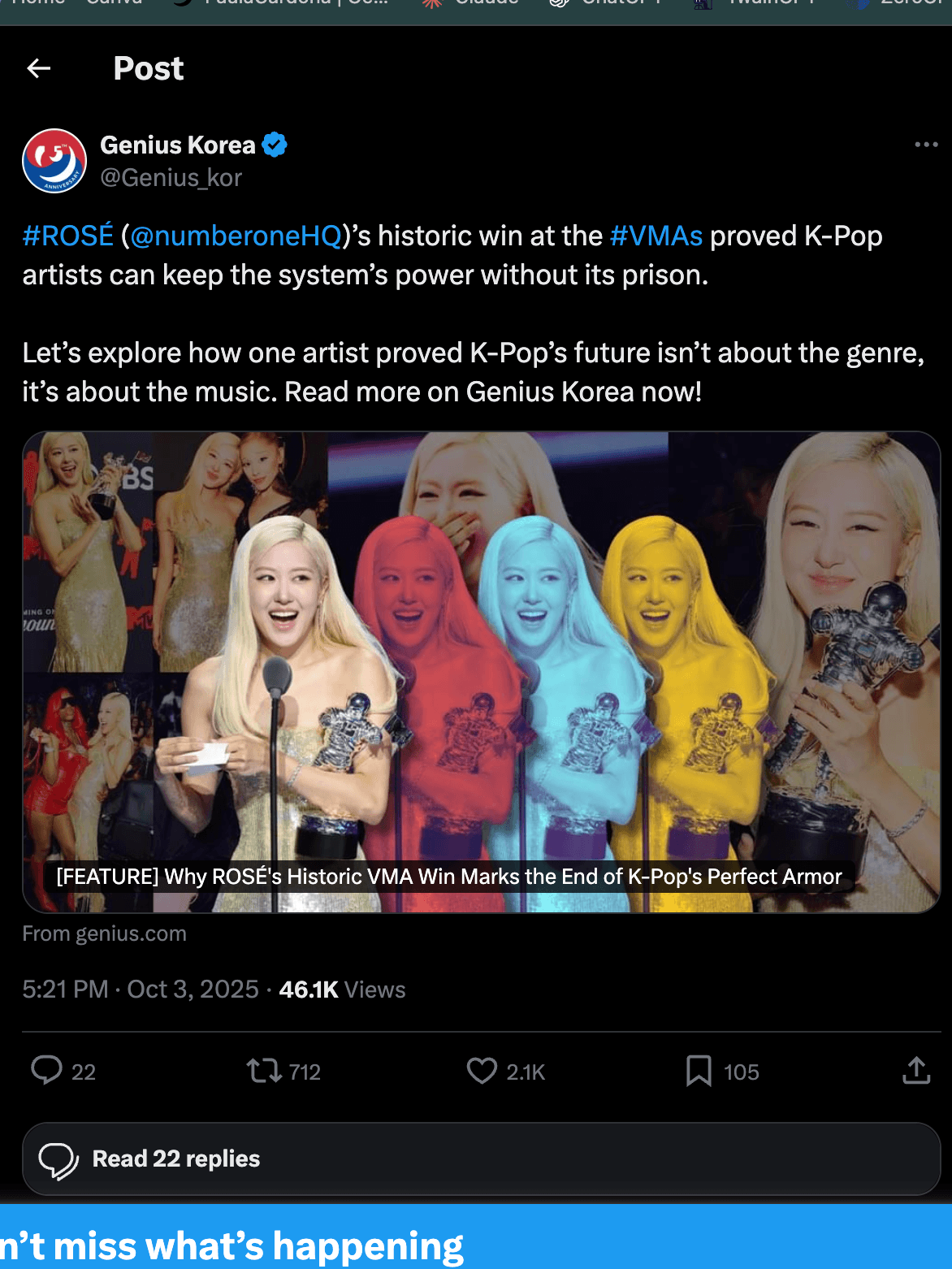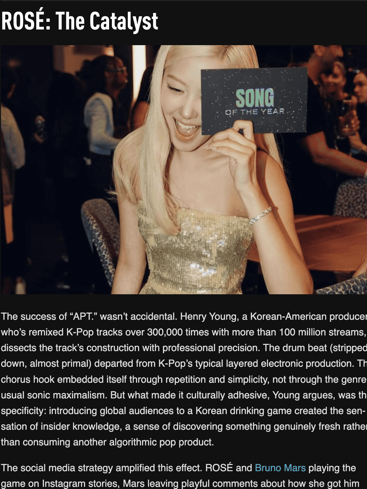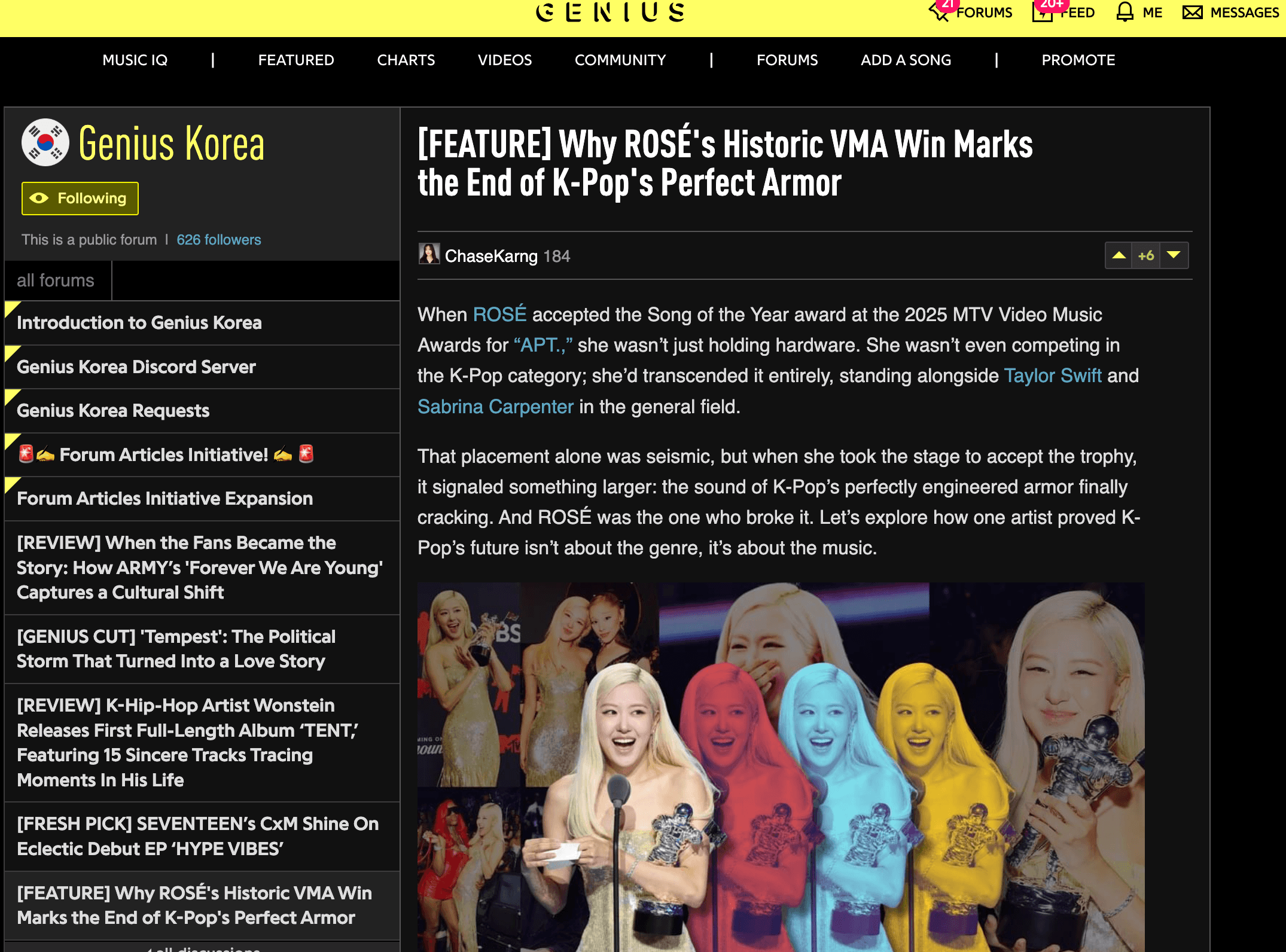 Edited and formatted a 2,500+ word feature article for Genius Korea analyzing ROSÉ's VMA win and its cultural impact on K-Pop. Transformed raw manuscript into web-ready content optimized for both website publication and social media distribution. Maintained the writer's voice while improving readability, adding HTML formatting, embedding multimedia elements, and creating a cohesive narrative structure for multi-platform audiences.