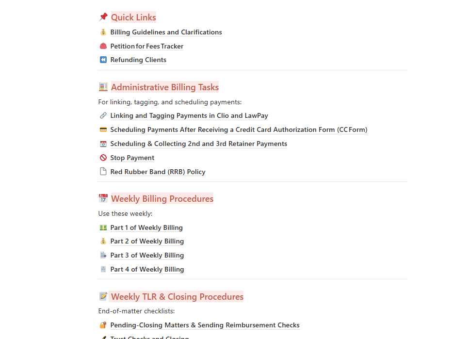 Using Noltion as the base tool, I was able to transform a chaotic law firm employee based knowledge into a detailed and visually appelaing database. Every role. Every task. Document. With variying access for all team members, it is now easier to onboard, train, and cover for all.